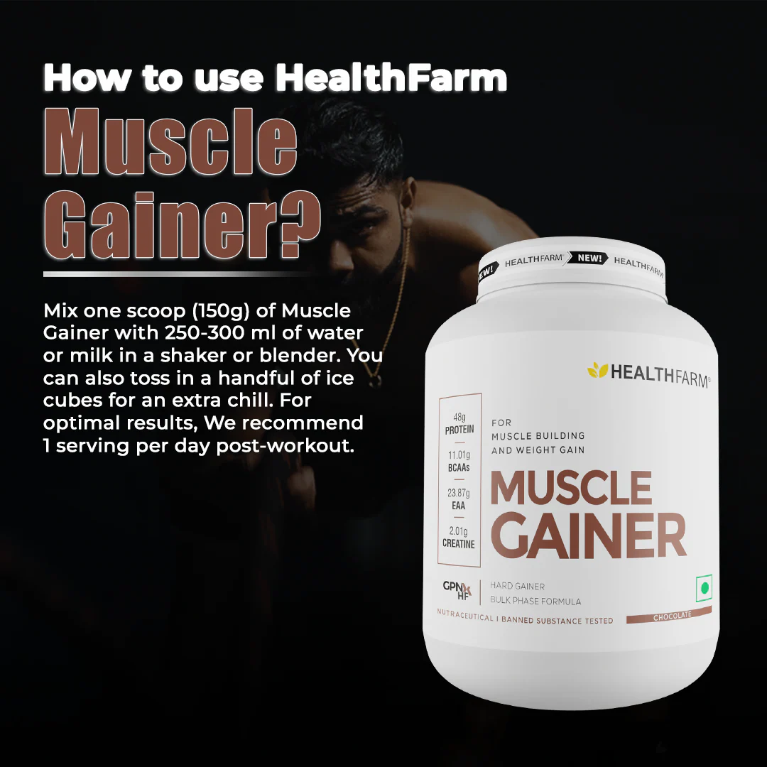 - Healthfarm Muscle Gainer delivers an impressive 48g of protein per serving, ideal for muscle repair and growth during bulking.